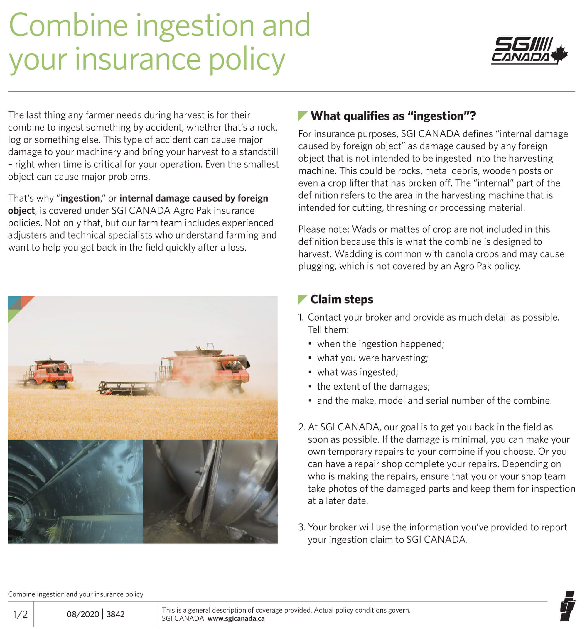Harvest in Saskatchewan is “go” time! Due to the hurried nature of the season sometimes accidents happen. That’s why “ingestion,” or internal damage caused by a foreign object, is covered under SGI CANADA Agro Pak insurance. Contact your Henderson Advisor to learn more.