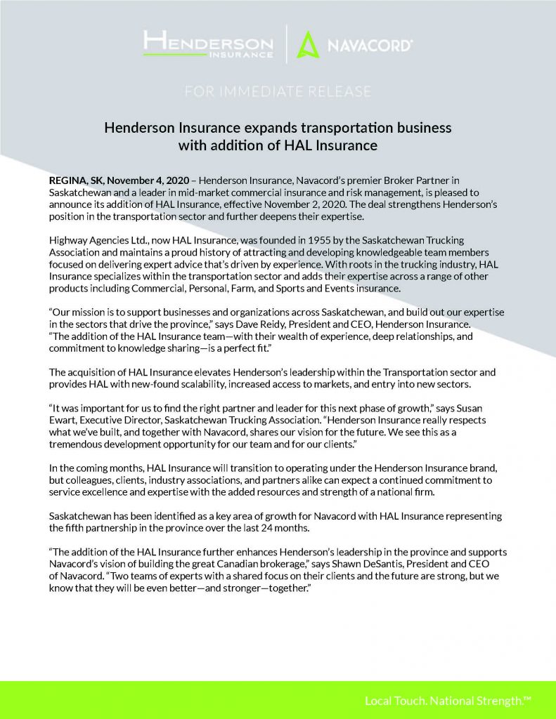 Henderson Insurance is pleased to announce that we have acquired Regina brokerage HAL Insurance. The addition of HAL further strengthens our position in the transportation sector and deepens our expertise.